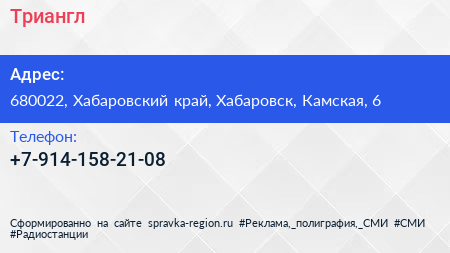 Триангл по адресу 680022, Хабаровский край, Хабаровск, Камская, 6 в дальнейшем Организация, размещена в следующих категориях: