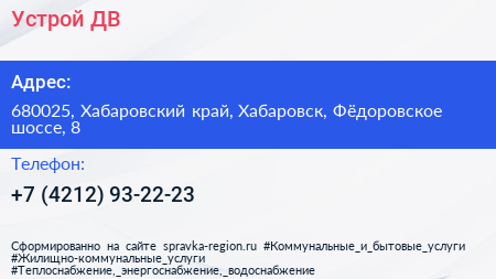 Устрой ДВ по адресу 680025, Хабаровский край, Хабаровск, Фёдоровское шоссе, 8 в дальнейшем Организация, размещена в следующих категориях: