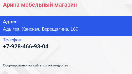 Арина, мебельный магазин по адресу Адыгея, Ханская, Верещагина, 180 в дальнейшем Организация, размещена в следующих категориях: