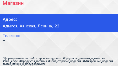 Магазин по адресу Адыгея, Ханская, Ленина, 22 в дальнейшем Организация, размещена в следующих категориях: