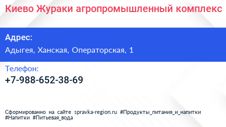 Киево-Жураки, агропромышленный комплекс по адресу Адыгея, Ханская, Операторская, 1 в дальнейшем Организация, размещена в следующих категориях:
