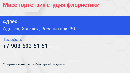 Мисс гортензия, студия флористики по адресу Адыгея, Ханская, Верещагина, 80 в дальнейшем Организация, размещена в следующих категориях: