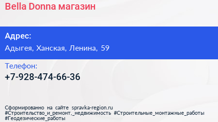 Bella Donna, магазин по адресу Адыгея, Ханская, Ленина, 59 в дальнейшем Организация, размещена в следующих категориях: