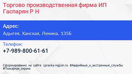Торгово-производственная фирма, ИП Гаспарян Р.Н. по адресу Адыгея, Ханская, Ленина, 135Б в дальнейшем Организация, размещена в следующих категориях: