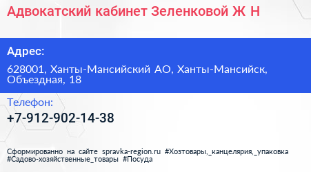 Адвокатский кабинет Зеленковой Ж.Н. по адресу 628001, Ханты-Мансийский АО, Ханты-Мансийск, Объездная, 18 в дальнейшем Организация, размещена в следующих категориях: