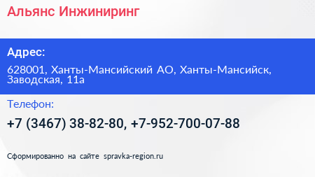 Альянс-Инжиниринг по адресу 628001, Ханты-Мансийский АО, Ханты-Мансийск, Заводская, 11а в дальнейшем Организация, размещена в следующих категориях: