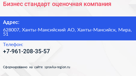 Бизнес стандарт, оценочная компания по адресу 628007, Ханты-Мансийский АО, Ханты-Мансийск, Мира, 51 в дальнейшем Организация, размещена в следующих категориях: