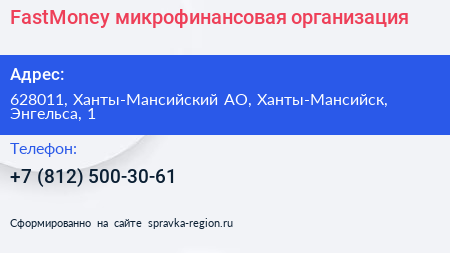 FastMoney, микрофинансовая организация по адресу 628011, Ханты-Мансийский АО, Ханты-Мансийск, Энгельса, 1 в дальнейшем Организация, размещена в следующих категориях: