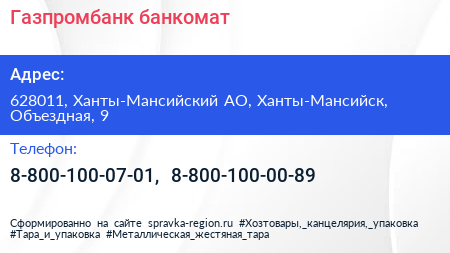 Газпромбанк, банкомат по адресу 628011, Ханты-Мансийский АО, Ханты-Мансийск, Объездная, 9 в дальнейшем Организация, размещена в следующих категориях: