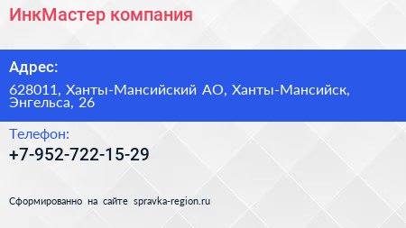 ИнкМастер, компания по адресу 628011, Ханты-Мансийский АО, Ханты-Мансийск, Энгельса, 26 в дальнейшем Организация, размещена в следующих категориях: