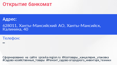 Открытие, банкомат по адресу 628011, Ханты-Мансийский АО, Ханты-Мансийск, Калинина, 40 в дальнейшем Организация, размещена в следующих категориях: