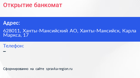 Открытие, банкомат по адресу 628011, Ханты-Мансийский АО, Ханты-Мансийск, Карла Маркса, 17 в дальнейшем Организация, размещена в следующих категориях: