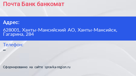 Почта Банк, банкомат по адресу 628001, Ханты-Мансийский АО, Ханты-Мансийск, Гагарина, 284 в дальнейшем Организация, размещена в следующих категориях: