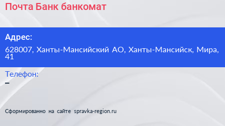 Почта Банк, банкомат по адресу 628007, Ханты-Мансийский АО, Ханты-Мансийск, Мира, 41 в дальнейшем Организация, размещена в следующих категориях: