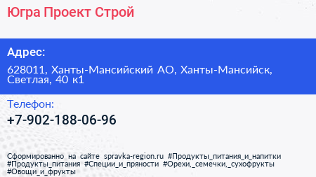 Югра-Проект-Строй по адресу 628011, Ханты-Мансийский АО, Ханты-Мансийск, Светлая, 40 к1 в дальнейшем Организация, размещена в следующих категориях: