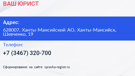 ВАШ ЮРИСТ по адресу 628007, Ханты-Мансийский АО, Ханты-Мансийск, Шевченко, 19 в дальнейшем Организация, размещена в следующих категориях: