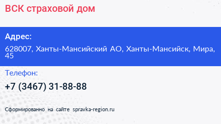 ВСК, страховой дом по адресу 628007, Ханты-Мансийский АО, Ханты-Мансийск, Мира, 45 в дальнейшем Организация, размещена в следующих категориях: