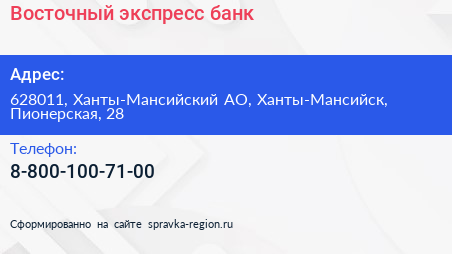 Восточный экспресс банк по адресу 628011, Ханты-Мансийский АО, Ханты-Мансийск, Пионерская, 28 в дальнейшем Организация, размещена в следующих категориях: