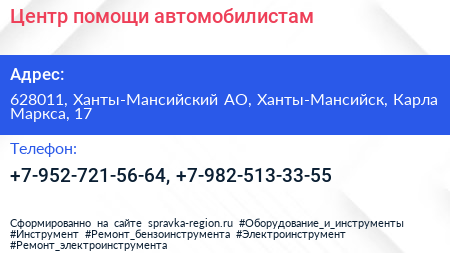 Центр помощи автомобилистам по адресу 628011, Ханты-Мансийский АО, Ханты-Мансийск, Карла Маркса, 17 в дальнейшем Организация, размещена в следующих категориях: