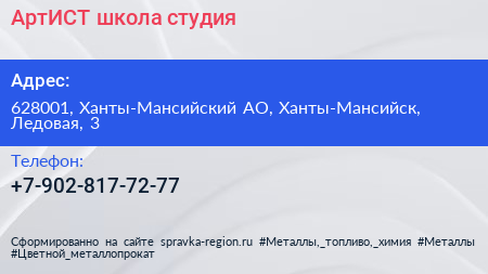 АртИСТ, школа-студия по адресу 628001, Ханты-Мансийский АО, Ханты-Мансийск, Ледовая, 3 в дальнейшем Организация, размещена в следующих категориях: