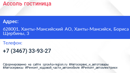 Ассоль, гостиница по адресу 628001, Ханты-Мансийский АО, Ханты-Мансийск, Бориса Щербины, 3 в дальнейшем Организация, размещена в следующих категориях: