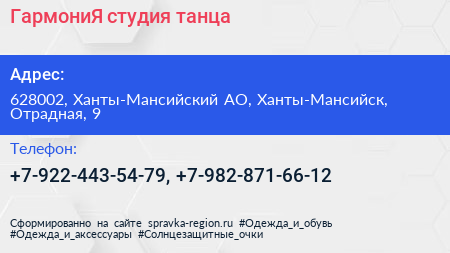 ГармониЯ, студия танца по адресу 628002, Ханты-Мансийский АО, Ханты-Мансийск, Отрадная, 9 в дальнейшем Организация, размещена в следующих категориях: