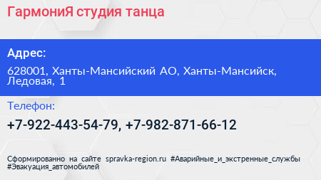 ГармониЯ, студия танца по адресу 628001, Ханты-Мансийский АО, Ханты-Мансийск, Ледовая, 1 в дальнейшем Организация, размещена в следующих категориях: