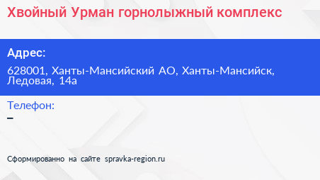 Хвойный Урман, горнолыжный комплекс по адресу 628001, Ханты-Мансийский АО, Ханты-Мансийск, Ледовая, 14а в дальнейшем Организация, размещена в следующих категориях: