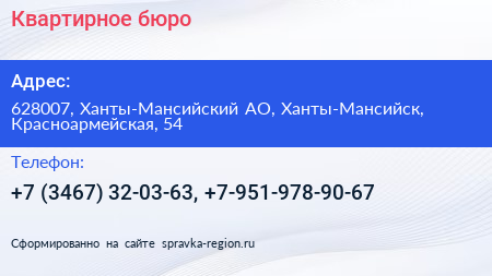 Квартирное бюро по адресу 628007, Ханты-Мансийский АО, Ханты-Мансийск, Красноармейская, 54 в дальнейшем Организация, размещена в следующих категориях: