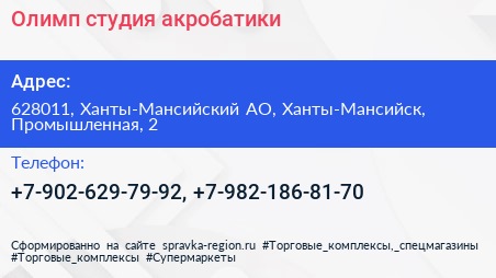 Олимп, студия акробатики по адресу 628011, Ханты-Мансийский АО, Ханты-Мансийск, Промышленная, 2 в дальнейшем Организация, размещена в следующих категориях: