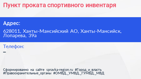 Пункт проката спортивного инвентаря по адресу 628011, Ханты-Мансийский АО, Ханты-Мансийск, Лопарева, 39а в дальнейшем Организация, размещена в следующих категориях: