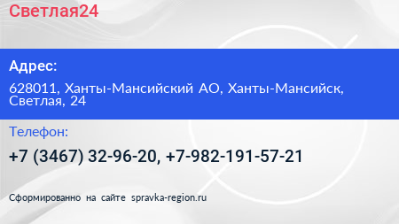 Светлая24 по адресу 628011, Ханты-Мансийский АО, Ханты-Мансийск, Светлая, 24 в дальнейшем Организация, размещена в следующих категориях: