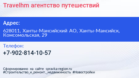 Travelhm, агентство путешествий по адресу 628011, Ханты-Мансийский АО, Ханты-Мансийск, Комсомольская, 29 в дальнейшем Организация, размещена в следующих категориях: