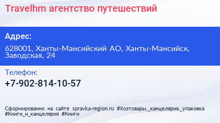 Travelhm, агентство путешествий по адресу 628001, Ханты-Мансийский АО, Ханты-Мансийск, Заводская, 24 в дальнейшем Организация, размещена в следующих категориях: