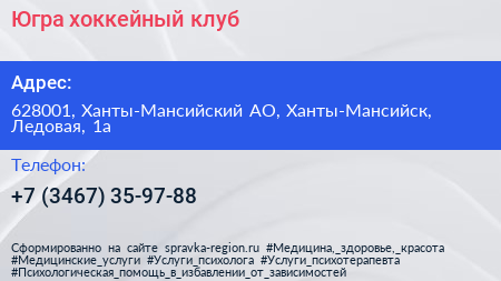 Югра, хоккейный клуб по адресу 628001, Ханты-Мансийский АО, Ханты-Мансийск, Ледовая, 1а в дальнейшем Организация, размещена в следующих категориях: