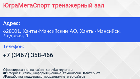 ЮграМегаСпорт, тренажерный зал по адресу 628001, Ханты-Мансийский АО, Ханты-Мансийск, Ледовая, 1 в дальнейшем Организация, размещена в следующих категориях: