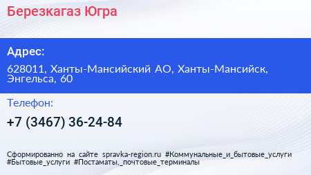 Березкагаз Югра по адресу 628011, Ханты-Мансийский АО, Ханты-Мансийск, Энгельса, 60 в дальнейшем Организация, размещена в следующих категориях: