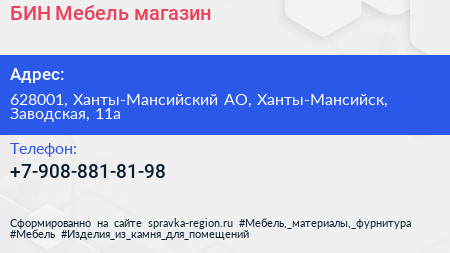 БИН Мебель, магазин по адресу 628001, Ханты-Мансийский АО, Ханты-Мансийск, Заводская, 11а в дальнейшем Организация, размещена в следующих категориях: