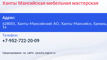Ханты-Мансийская мебельная мастерская по адресу 628001, Ханты-Мансийский АО, Ханты-Мансийск, Ермака, 1а в дальнейшем Организация, размещена в следующих категориях: