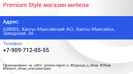 Premium Style, магазин мебели по адресу 628001, Ханты-Мансийский АО, Ханты-Мансийск, Заводская, 26 в дальнейшем Организация, размещена в следующих категориях: