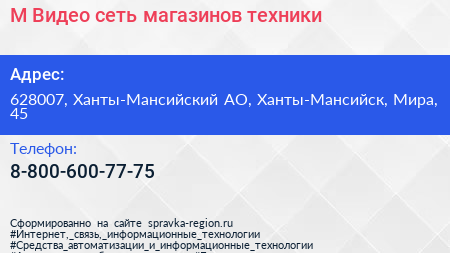 М.Видео, сеть магазинов техники по адресу 628007, Ханты-Мансийский АО, Ханты-Мансийск, Мира, 45 в дальнейшем Организация, размещена в следующих категориях: