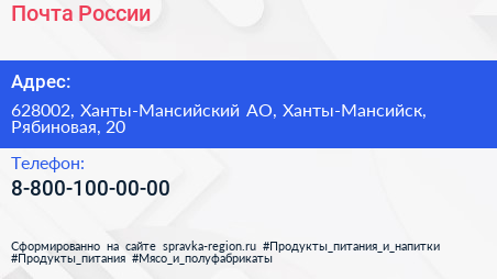 Почта России по адресу 628002, Ханты-Мансийский АО, Ханты-Мансийск, Рябиновая, 20 в дальнейшем Организация, размещена в следующих категориях:
