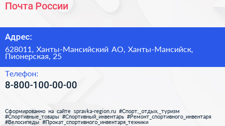 Почта России по адресу 628011, Ханты-Мансийский АО, Ханты-Мансийск, Пионерская, 25 в дальнейшем Организация, размещена в следующих категориях: