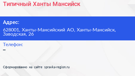 Типичный Ханты-Мансийск по адресу 628001, Ханты-Мансийский АО, Ханты-Мансийск, Заводская, 26 в дальнейшем Организация, размещена в следующих категориях: