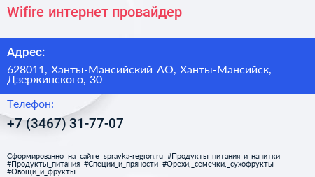 Wifire, интернет-провайдер по адресу 628011, Ханты-Мансийский АО, Ханты-Мансийск, Дзержинского, 30 в дальнейшем Организация, размещена в следующих категориях: