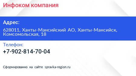 Инфоком, компания по адресу 628011, Ханты-Мансийский АО, Ханты-Мансийск, Комсомольская, 18 в дальнейшем Организация, размещена в следующих категориях: