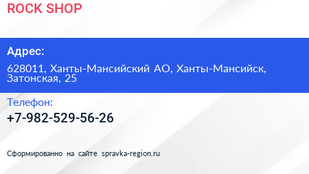 ROCK-SHOP по адресу 628011, Ханты-Мансийский АО, Ханты-Мансийск, Затонская, 25 в дальнейшем Организация, размещена в следующих категориях: