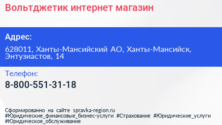 Вольтджетик, интернет-магазин по адресу 628011, Ханты-Мансийский АО, Ханты-Мансийск, Энтузиастов, 14 в дальнейшем Организация, размещена в следующих категориях: