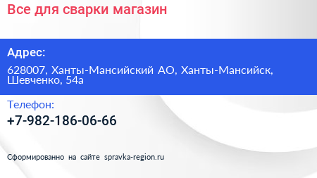 Все для сварки, магазин по адресу 628007, Ханты-Мансийский АО, Ханты-Мансийск, Шевченко, 54а в дальнейшем Организация, размещена в следующих категориях: