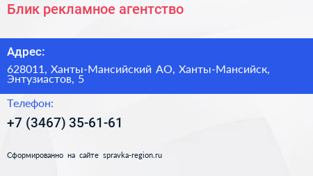 Блик, рекламное агентство по адресу 628011, Ханты-Мансийский АО, Ханты-Мансийск, Энтузиастов, 5 в дальнейшем Организация, размещена в следующих категориях: